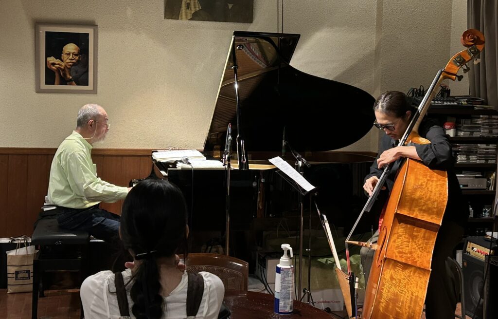 残暑も少し緩んだ大阪、この日の寺井尚之(p)+宮本在浩(b)デュオ“Special Selection”は、お客様全員がミュージシャン。中には赤ちゃんのときからOverSeasに来ていた方々も。