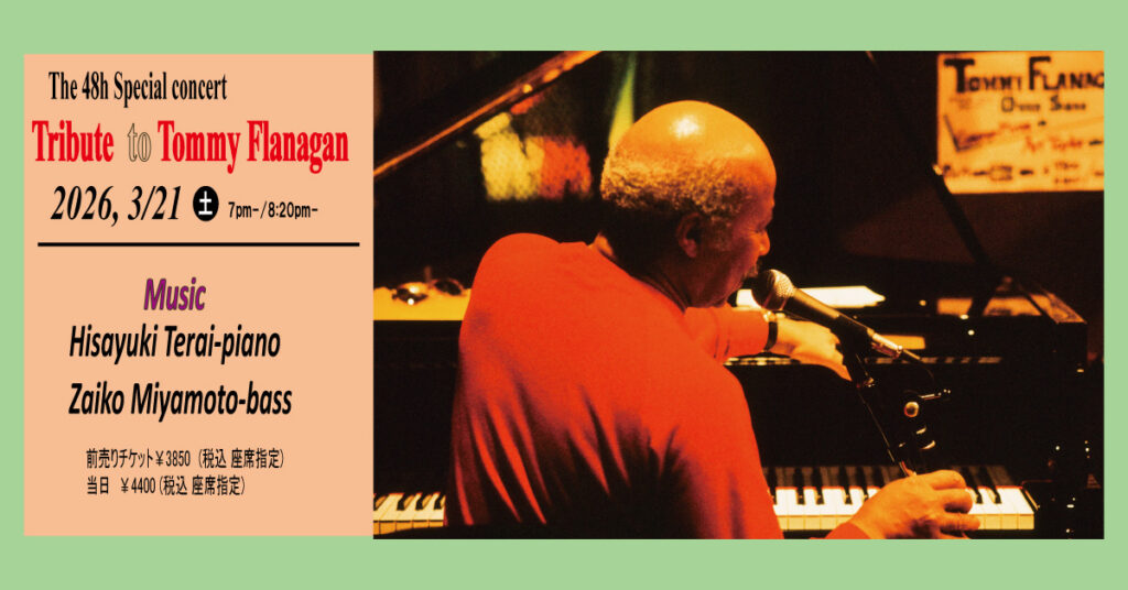 This year of 2025, pianist and owner of Jazz Club OverSeas, Hisayuki Terai with Zaiko Miyamoto on bass will hold his special tribute concert to his mentor, Tommy Flanagan on the anniversary of his passing.